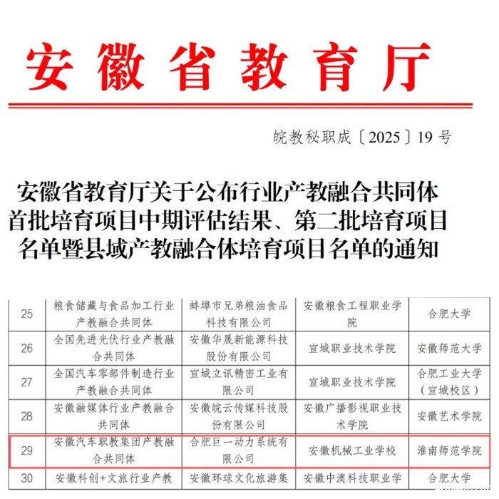 根据《安徽省教育厅关于开展安徽省行业产教融合共同体首批培育项目中期评估及第二批培育项目申报和启动县域产教融合体建设工作的通知》(皖教秘职成〔2024〕77号)要求,经专家评审、认定,我校申报的安徽汽车职教集团产教融合共同体成功入选第二批行业产教融合共同体培育项目。