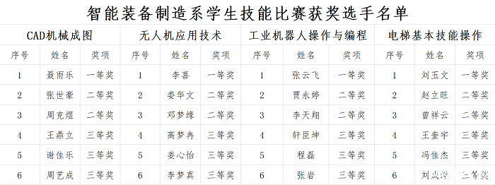 此次比赛开设CAD机械成图、无人机应用技术、工业机器人操作与编程、电梯基本技能操作四个赛项,共119名学生参加比赛。裁判员认真严谨、公正严明,参赛选手沉着冷静、积极应战,充分展现了职教学子奋斗拼搏、勇争一流的精神风貌。经过激烈角逐,共24位学生脱颖而出,他们将作为市赛和省赛的后备人选,力争取得更大突破。